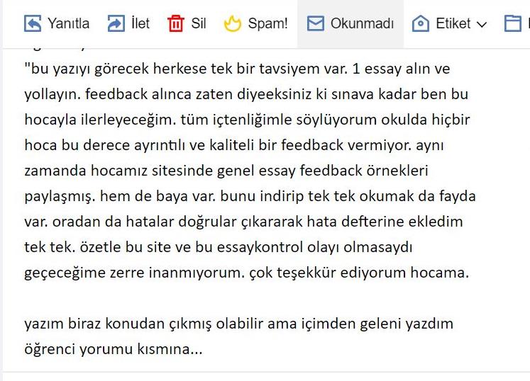 “bu yazıyı görecek herkese tek bir tavsiyem var. 1 essay alın ve yollayın. feedback alınca zaten diyeeksiniz ki sınava kadar ben bu hocayla ilerleyeceğim. tüm içtenliğimle söylüyorum okulda hiçbir hoca bu derece ayrıntılı ve kaliteli bir feedback vermiyor. aynı zamanda hocamız sitesinde genel essay feedback örnekleri paylaşmış. hem de baya var. bunu indirip tek tek okumak da fayda var. oradan da hatalar doğrular çıkararak hata defterine ekledim tek tek. özetle bu site ve bu essaykontrol olayı olmasaydı geçeceğime zerre inanmıyorum. çok teşekkür ediyorum hocama.”